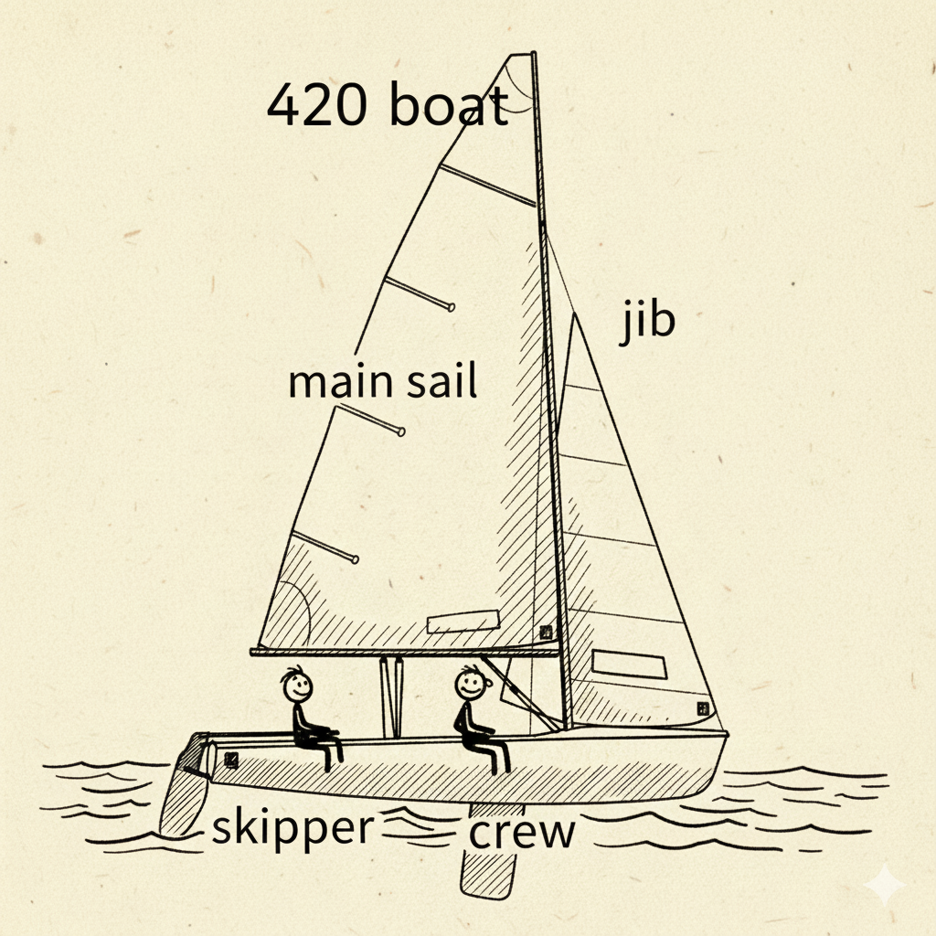 I mainly learned on a two person small size sailboat called “420” : it fully operates only with lines, no intuitive steering wheels or handles to change the direction, and a skipper who controls the main sail at the back, and a crew who manages the front jib(smaller sail).
